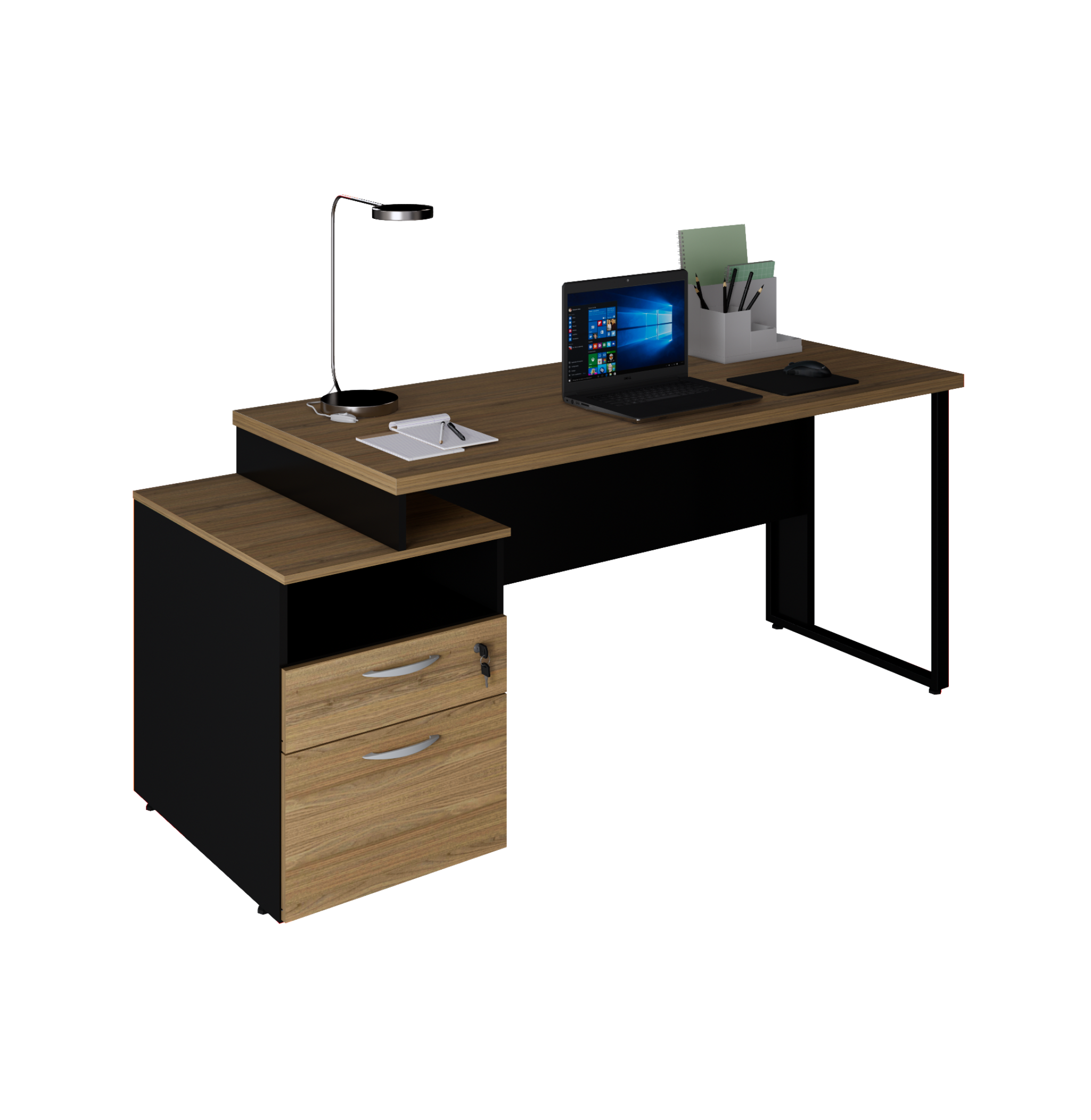 O gaveteiro pode ser localizado na lateral ou abaixo da mesa, com uma ou mais gavetas, oferecendo espaço para itens de uso diário sem comprometer a área de trabalho. Essa integração otimiza o espaço, evita a necessidade de móveis adicionais e contribui para um ambiente mais organizado.